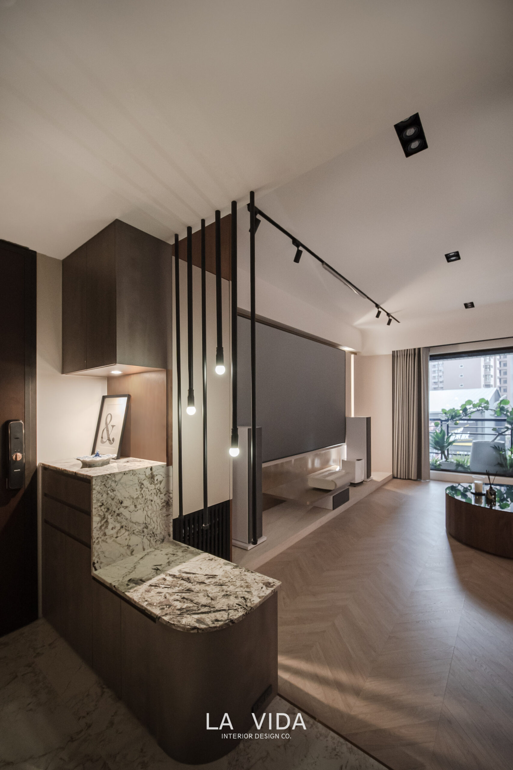 本案以「飛行中的機艙」為靈感,大面窗景帶來高空視角,玄關如登機通道,客餐廳則如穿越雲層後的豁然開朗。